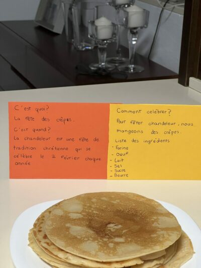 - Introducción cultural sobre el Día de las Candelarias y las tradiciones francesas, con vocabulario específico en francés.